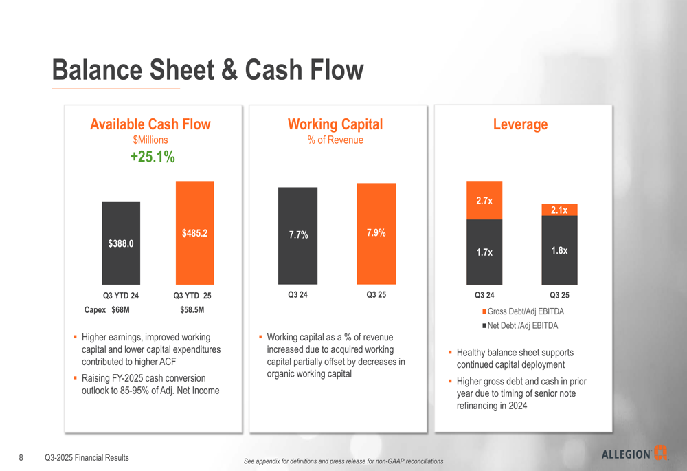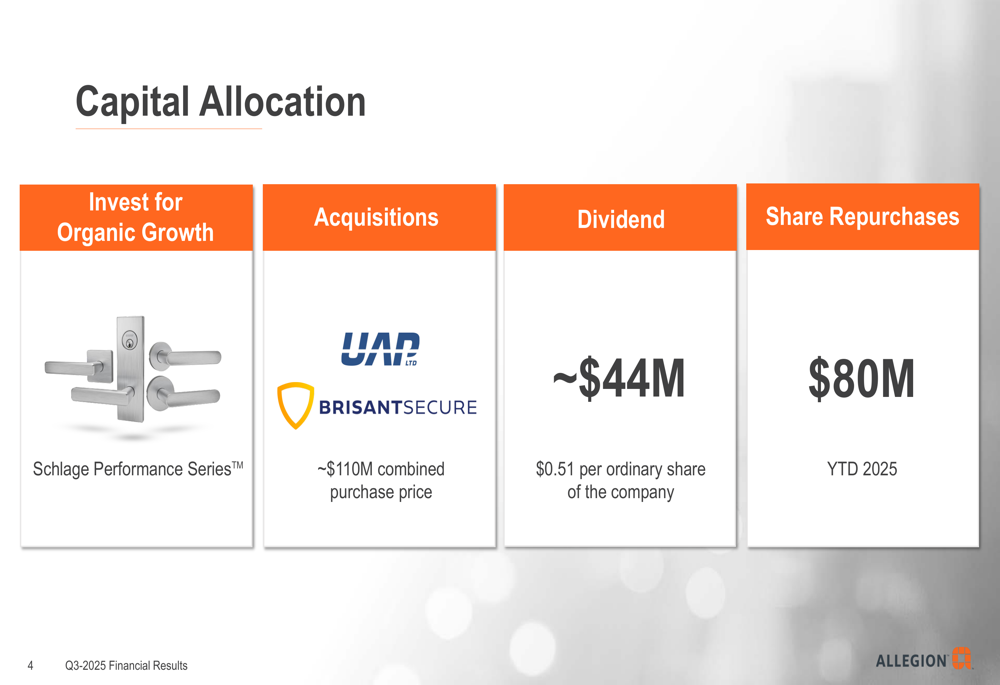 The company allocated approximately $44 million for dividends ($0.51 per ordinary share) and $80 million for share repurchases year-to-date. Additionally, Allegion invested approximately $110 million in acquisitions, including Brisant Secure, which is expected to enhance the company’s product portfolio and market reach.