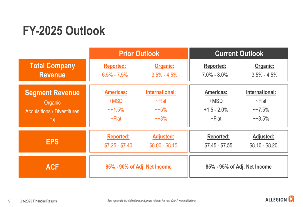 Based on its strong performance, Allegion has raised its full-year 2025 outlook. The company now expects total revenue growth of 7.0% to 8.0%, up from the previous guidance of 6.5% to 7.5%, while maintaining its organic growth forecast of 3.5% to 4.5%.