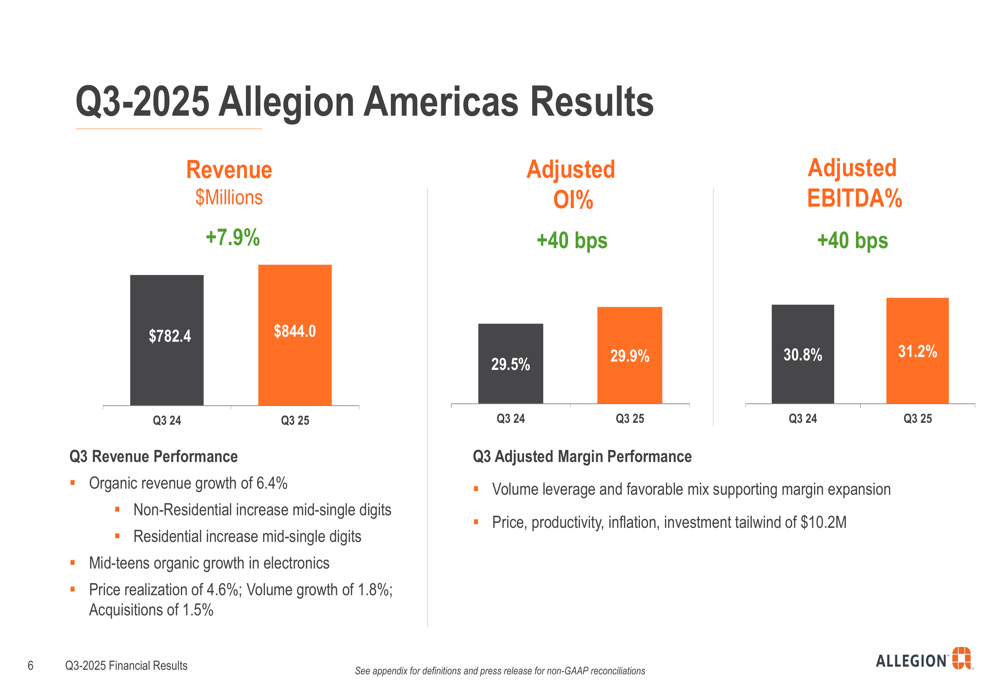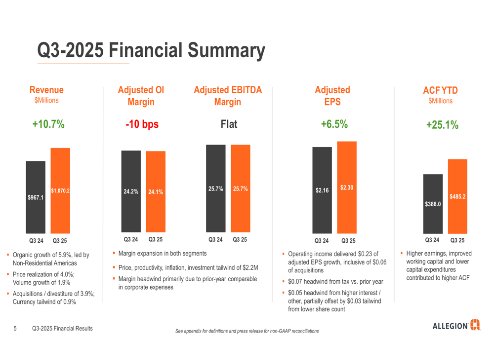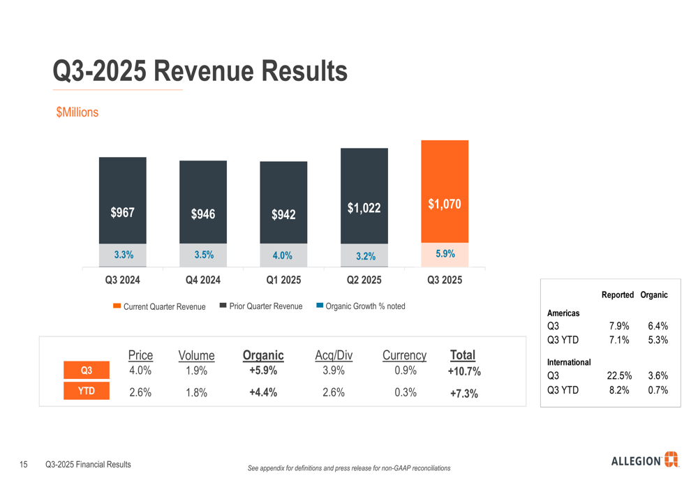 Allegion reported Q3 2025 revenue of $1,070.2 million, representing a 10.7% increase compared to the same period last year. This growth was driven by organic growth of 5.9%, acquisitions contributing 3.9%, and favorable currency impacts adding 0.9%.