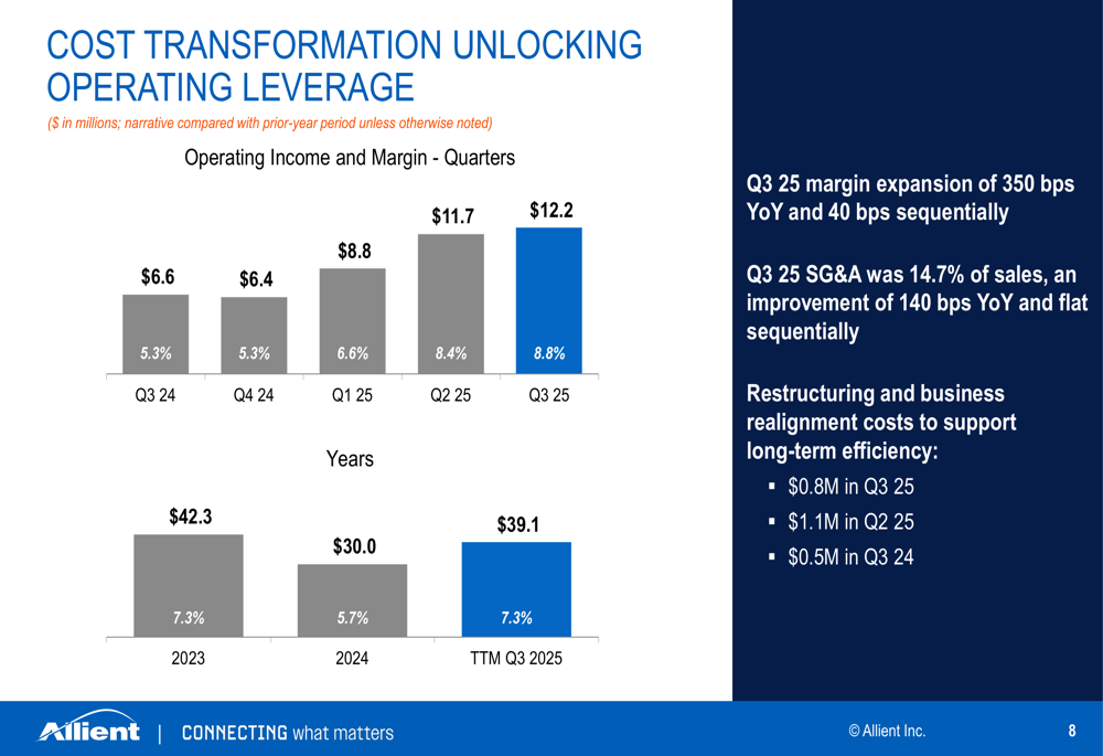 Operating margin expanded to 8.8% in Q3 2025, representing a 350 basis point improvement year-over-year. The company incurred $0.8 million in restructuring and business realignment costs during the quarter, which it views as investments to support long-term efficiency.