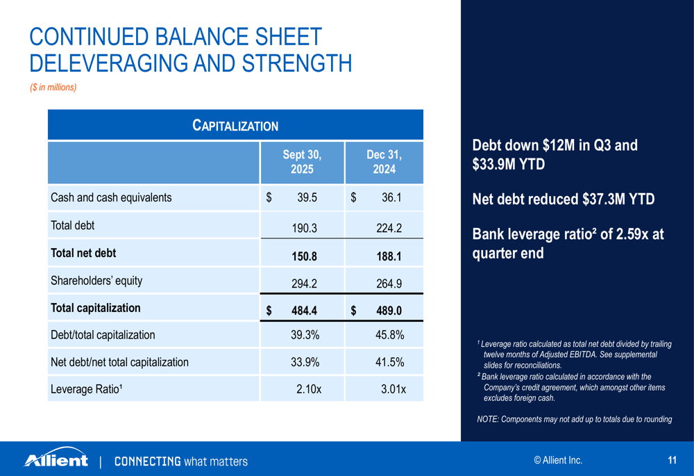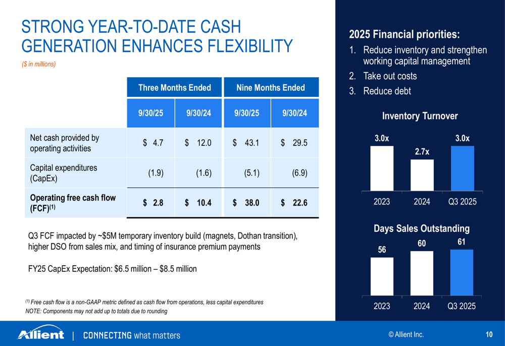 Allient's financial flexibility has improved significantly, with strong cash generation enabling substantial debt reduction: