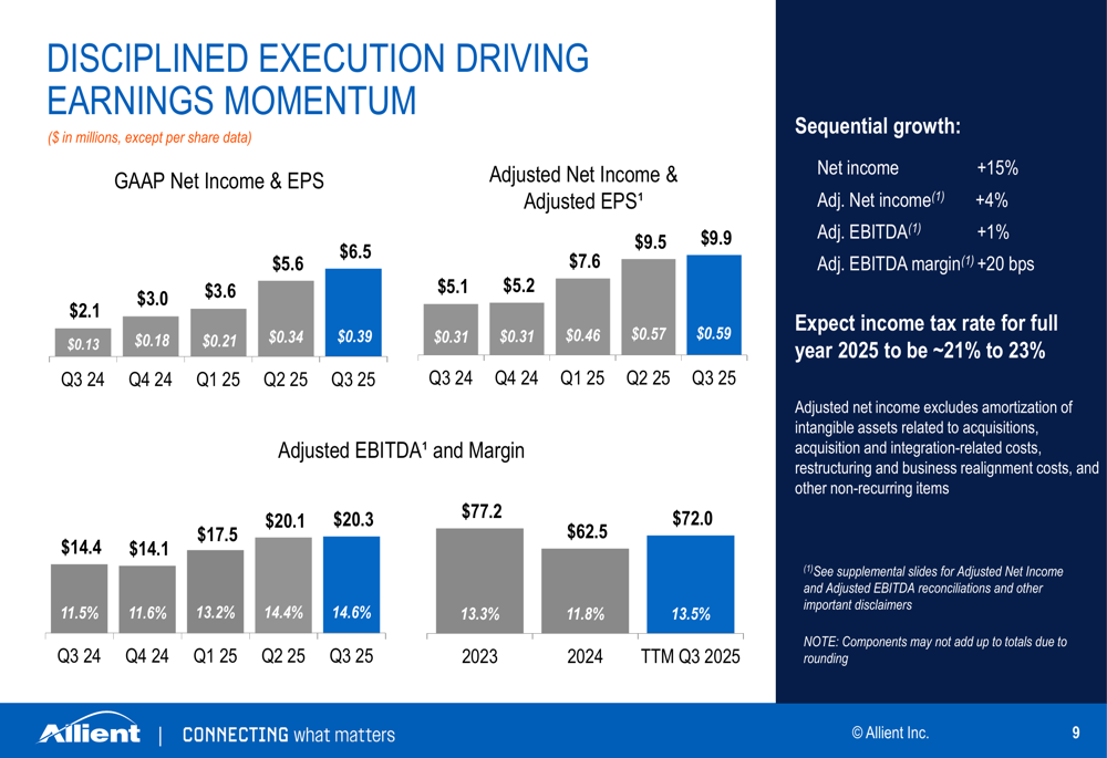 Allient reported Q3 2025 revenue of $138.7 million, representing an 11% increase year-over-year, though slightly down 1% sequentially from Q2. The company achieved impressive bottom-line growth with net income of $6.5 million, up 208% compared to Q3 2024 and 15% sequentially.