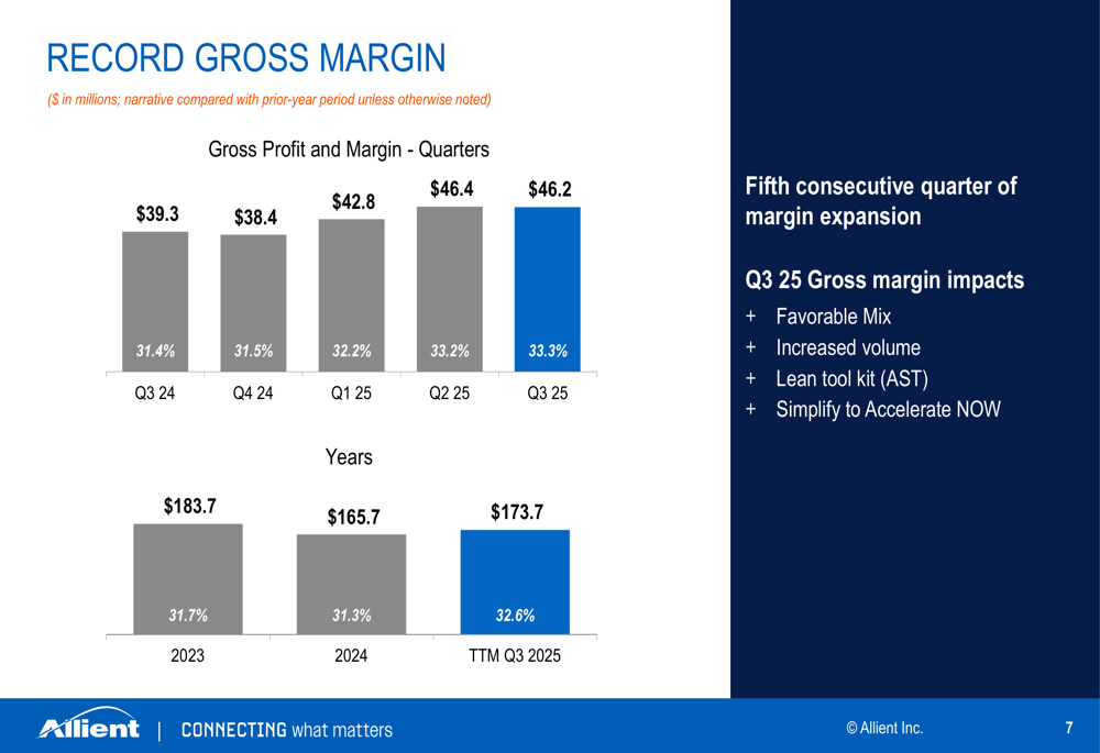 Gross margin reached a record 33.3%, improving 190 basis points year-over-year and 10 basis points sequentially. Operating margin expanded to 8.8%, up 350 basis points from the prior year. These improvements reflect Allient's strategic focus on higher-margin markets and operational efficiency initiatives.