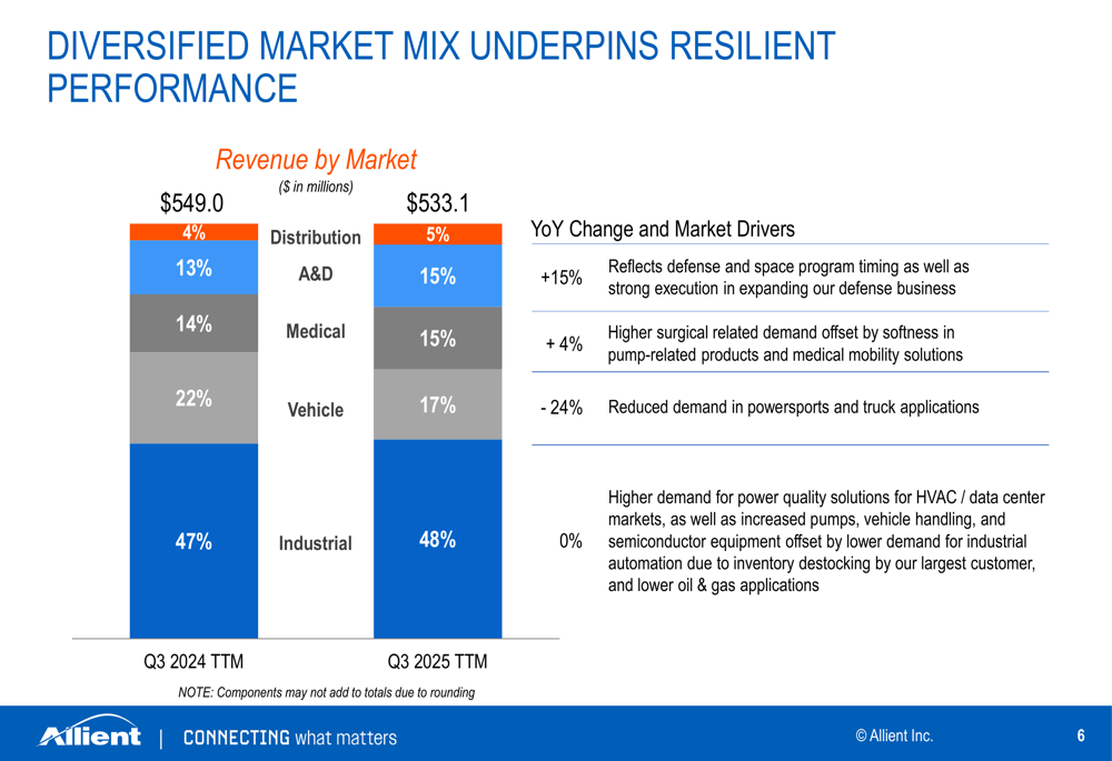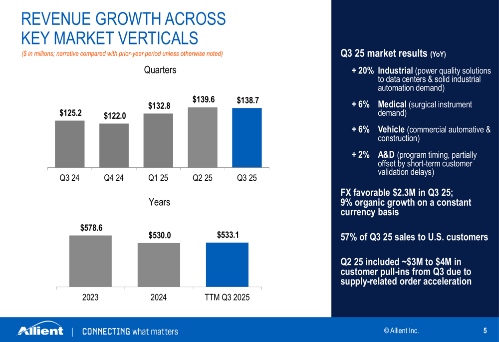 The industrial market, which represents nearly half of Allient's revenue, grew 20% year-over-year, while medical and vehicle segments each grew 6%. Aerospace & defense increased by 2%, reflecting continued execution on key defense programs.