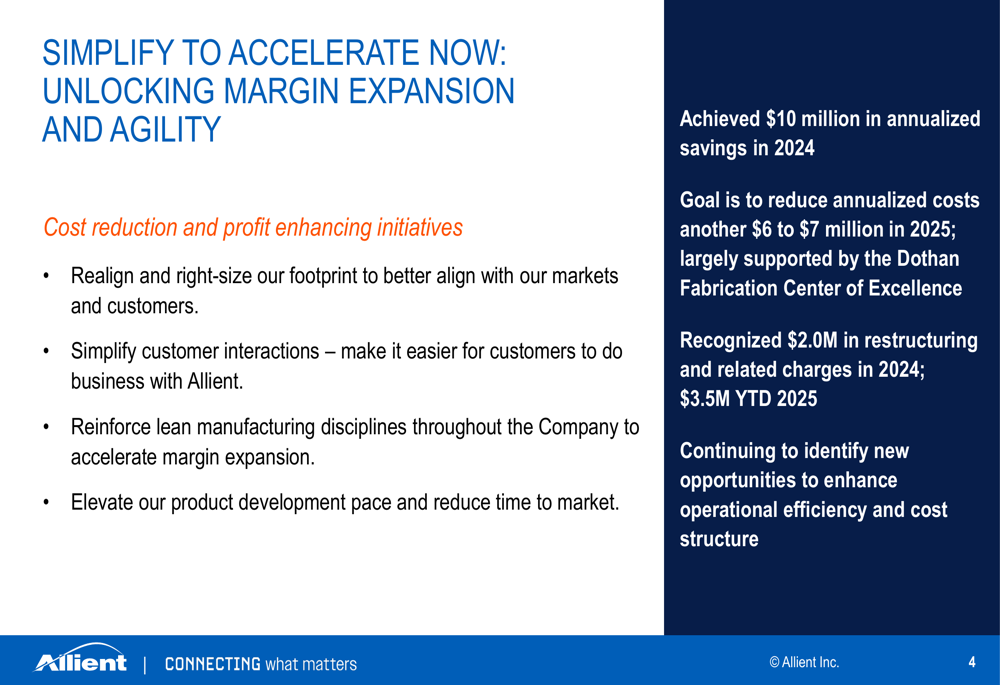 A key driver of Allient's improved profitability is its "Simplify to Accelerate NOW" initiative, which has delivered significant cost savings: