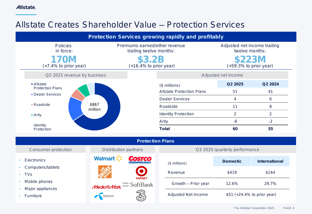 Beyond its core insurance business, Allstate has been expanding its Protection Services segment, which showed robust growth in Q2 2025. This segment reached 170 million policies in force, a 7.4% increase year-over-year, while generating $3.2 billion in premiums earned and other revenue, up 16.4% from the prior year. Adjusted net income for Protection Services rose impressively by 59.3% to $223 million.