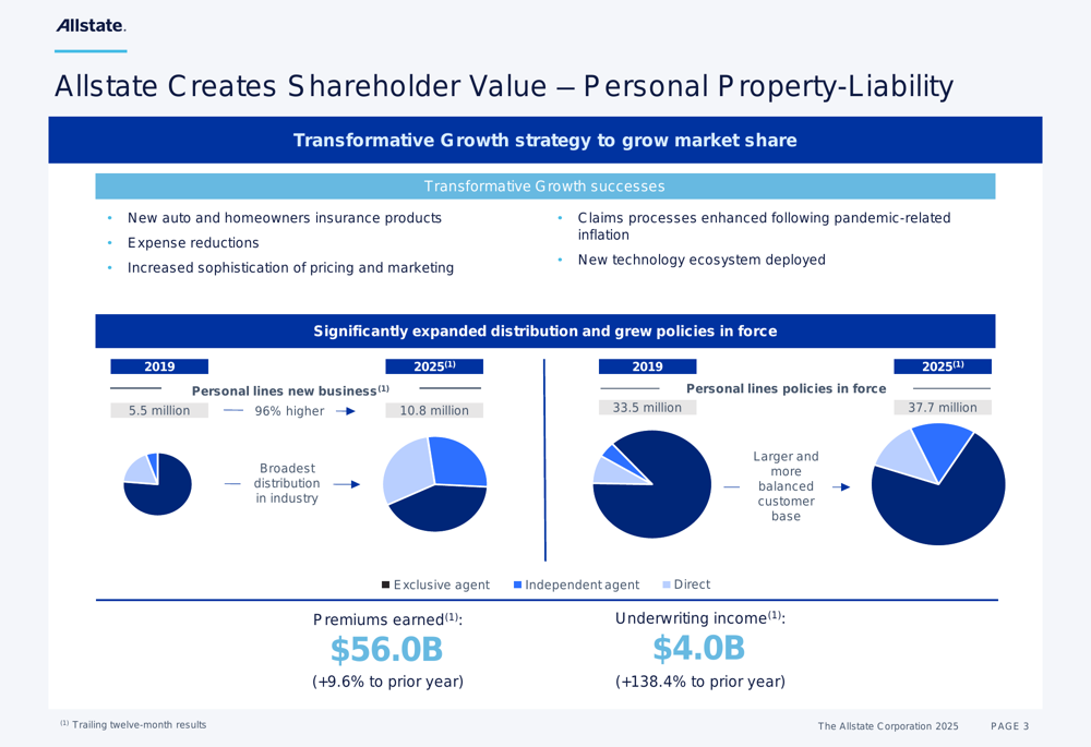 Allstate’s presentation highlighted its transformative growth strategy focused on increasing personal property-liability market share while leveraging the company’s brand, customer base, and capabilities. The insurer has successfully implemented several strategic initiatives, including new auto and homeowners insurance products, expense reductions, increased pricing sophistication, enhanced claims processes, and a new technology ecosystem.
