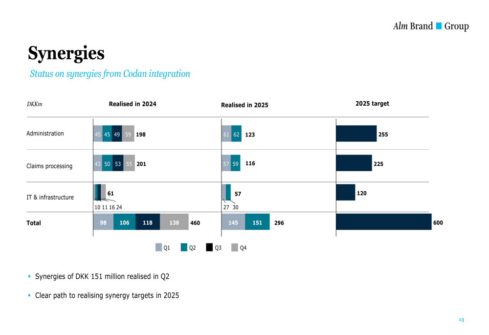 Alm. Brand continues to make significant progress in realizing synergies from the Codan integration. In Q2 2025, the company realized synergies of DKK 151 million, bringing the total for 2025 to DKK 296 million. The company remains confident in achieving its full-year target of DKK 600 million in synergies.