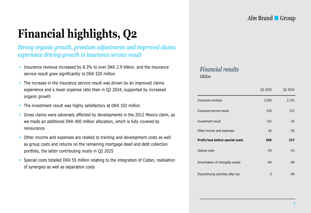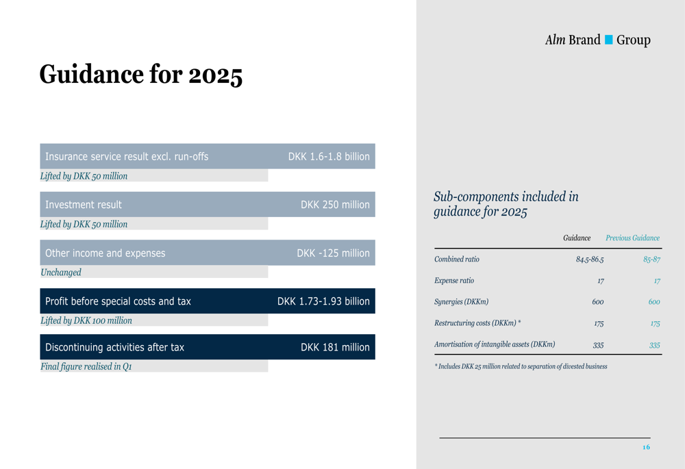 Based on the strong performance in the first half of 2025, Alm. Brand has raised its full-year guidance. The insurance service result excluding run-offs is now expected to be between DKK 1.6-1.8 billion, an increase of DKK 50 million from previous guidance. The investment result guidance has been lifted by DKK 50 million to DKK 250 million, and profit before special costs and tax is now expected to be between DKK 1.73-1.93 billion, an increase of DKK 100 million.