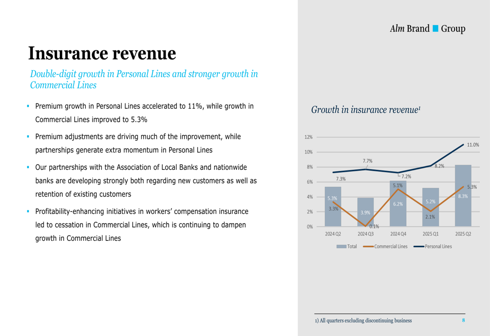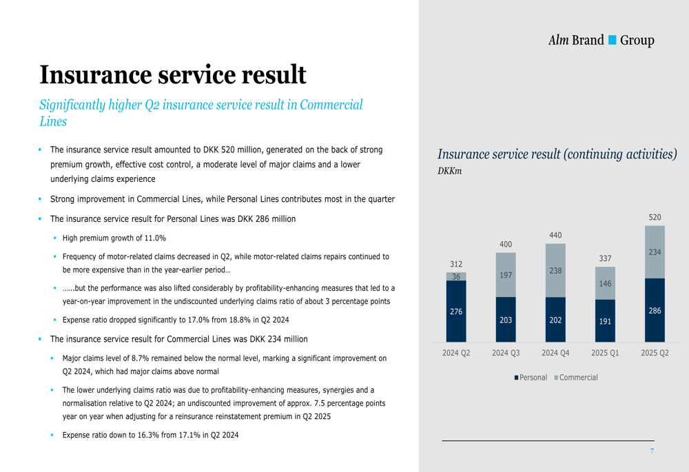 Commercial Lines also demonstrated solid improvement, with premium growth increasing to 5.3% compared to 2.1% in Q1 2025. The insurance service result for Commercial Lines reached DKK 234 million, a substantial increase from DKK 36 million in Q2 2024. The claims ratio improved by 13.3 percentage points, driven mainly by a decline in the undiscounted underlying claims ratio of approximately 7.5 percentage points.