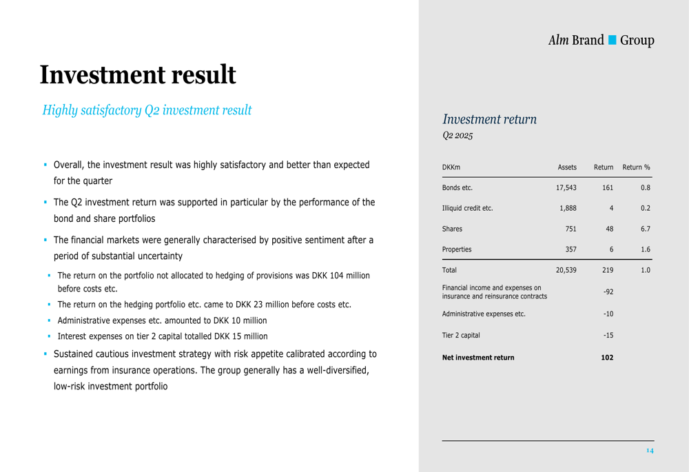 Alm. Brand’s investment portfolio delivered a highly satisfactory result of DKK 102 million in Q2 2025. The investment return was particularly supported by the performance of bond and share portfolios, with shares generating a 6.7% return and bonds delivering a 0.8% return.