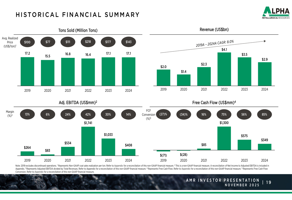 Alpha's presentation showcases a positive long-term financial trajectory, with revenue growing from $2.0 billion in 2019 to $2.9 billion in 2024, representing an 8.0% compound annual growth rate. However, this contrasts with the company's recent quarterly performance, where Adjusted EBITDA fell to $41.7 million in Q3 2025, down from $46.1 million in the previous quarter.