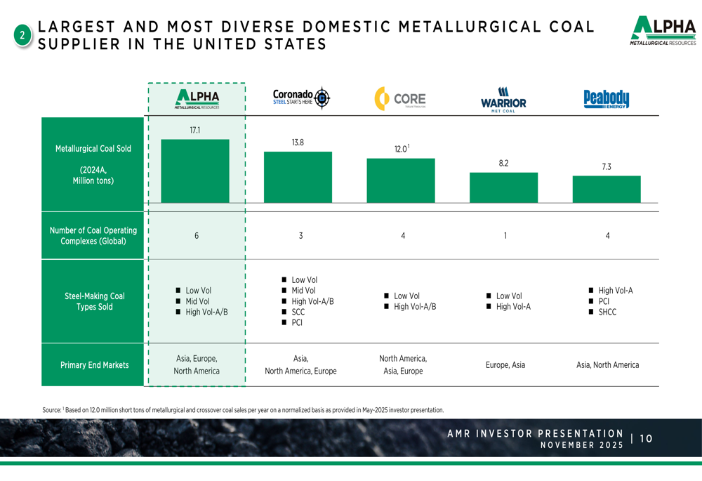 Alpha Metallurgical Resources positions itself as the largest and most diverse metallurgical coal supplier in the United States, with a production footprint spanning 19 mines and 8 preparation plants across the Eastern US. The company sold 17.1 million tons of coal in 2024, generating $2.9 billion in revenue and $408 million in Adjusted EBITDA.