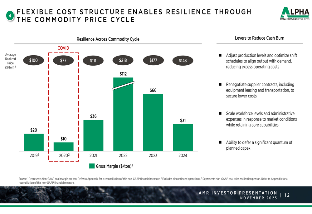 One bright spot in Alpha's recent performance has been its success in cost management. The company reported that cost of coal sales reached a record low since 2021 at $97.27 per ton in Q3 2025. This aligns with the presentation's emphasis on a flexible cost structure that enables resilience through commodity price cycles.