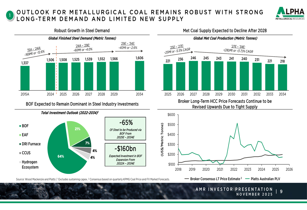 The market outlook presented in the investor materials shows expected growth in steel demand contrasted with declining metallurgical coal supply after 2028: