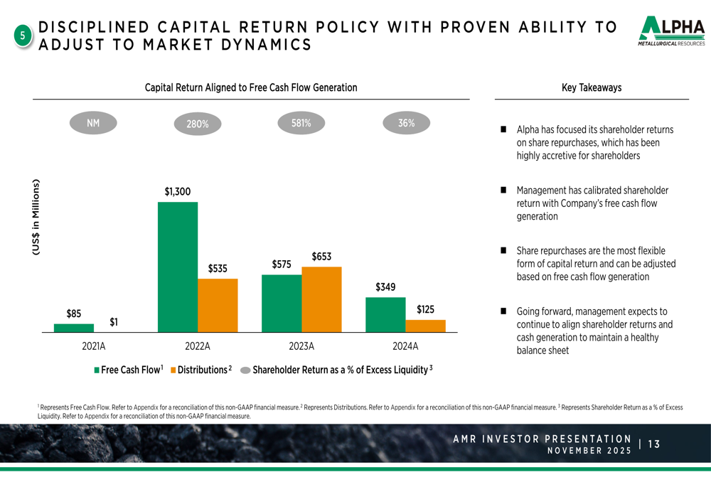 Alpha's presentation outlines a disciplined capital allocation strategy focused on maintaining balance sheet strength while returning value to shareholders primarily through share repurchases. The company emphasizes that this approach provides flexibility to adjust to market conditions, which has proven valuable given recent challenges.
