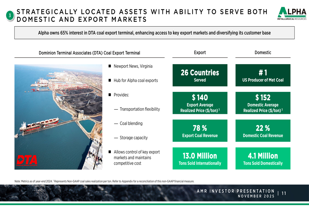 The company's strategic asset locations, particularly its ownership stake in the Dominion Terminal Associates (DTA) coal export terminal in Newport News, VA, provide Alpha with significant advantages in serving both domestic and international markets. In 2024, the company sold 13 million tons internationally across 26 countries, with exports representing 76% of total shipments.