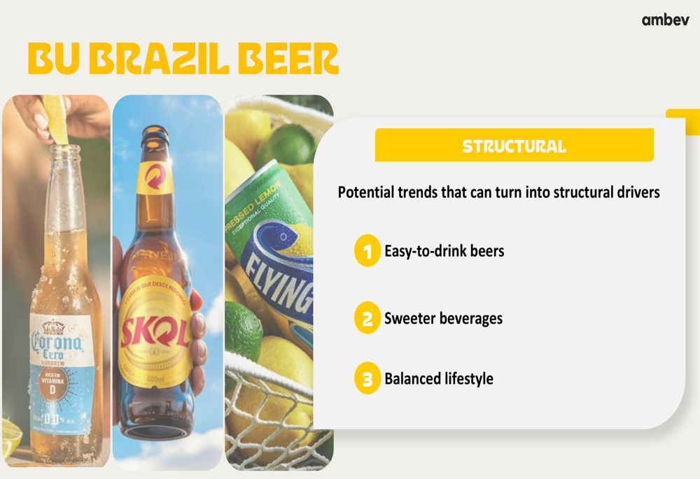 Ambev’s growth strategy continues to focus on three key pillars: leading and growing the category, digitizing and monetizing their ecosystem, and optimizing the business.