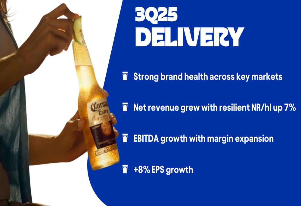 Ambev reported 7% EPS growth for Q3 2025, supported by net revenue growth with resilient net revenue per hectoliter (NR/hl) up 7% and EBITDA growth with margin expansion across most business units.