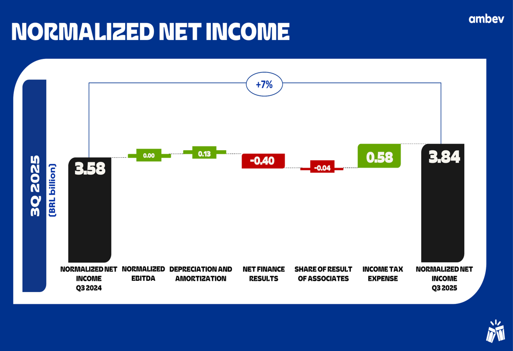 Ambev’s normalized net income for Q3 2025 reached 3.84 billion BRL, representing a 7% increase from 3.58 billion BRL in Q3 2024. This growth was supported by improvements in depreciation and amortization (+0.13) and income tax expense (+0.58), partially offset by negative impacts from net finance results (-0.40) and share of results from associates (-0.04).