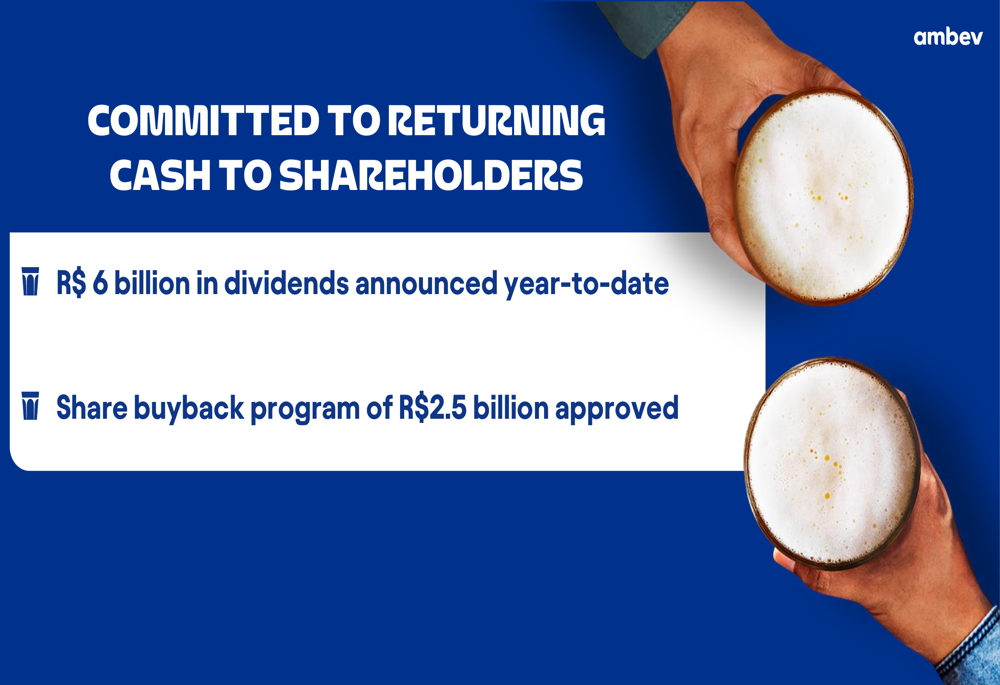 Ambev continues to prioritize shareholder returns, announcing 6 billion BRL in dividends year-to-date and approving a share buyback program of 2.5 billion BRL.