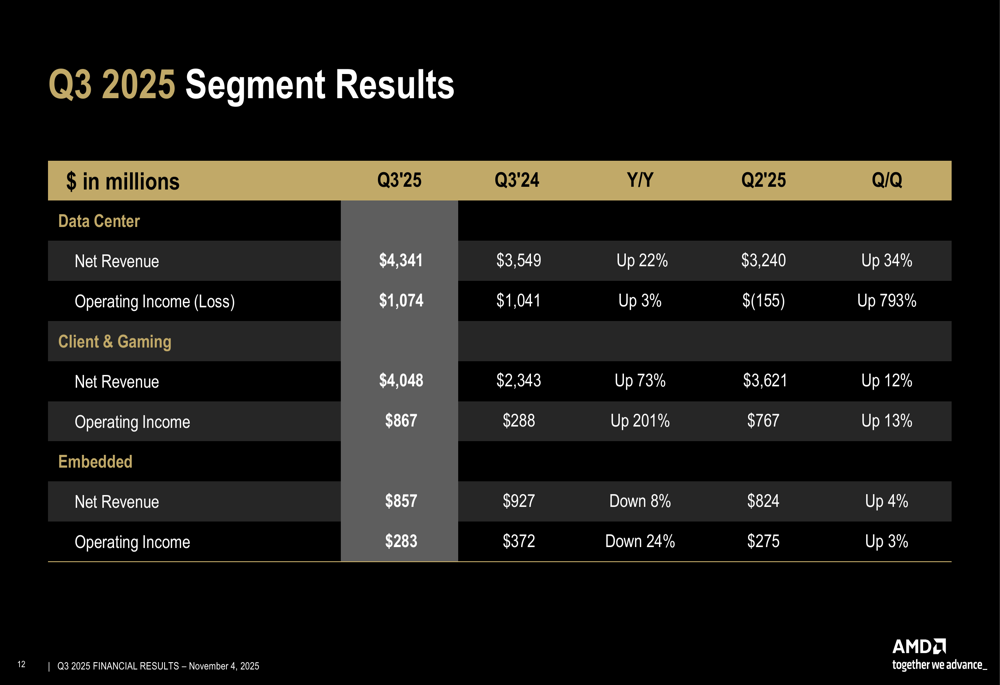 The Data Center segment generated $4.3 billion in revenue, up 22% year-over-year, driven by strong demand for 5th Gen EPYC processors and AMD Instinct MI350 Series GPUs. Operating income for this segment reached $1.1 billion, a slight increase from $1.0 billion in the prior year.