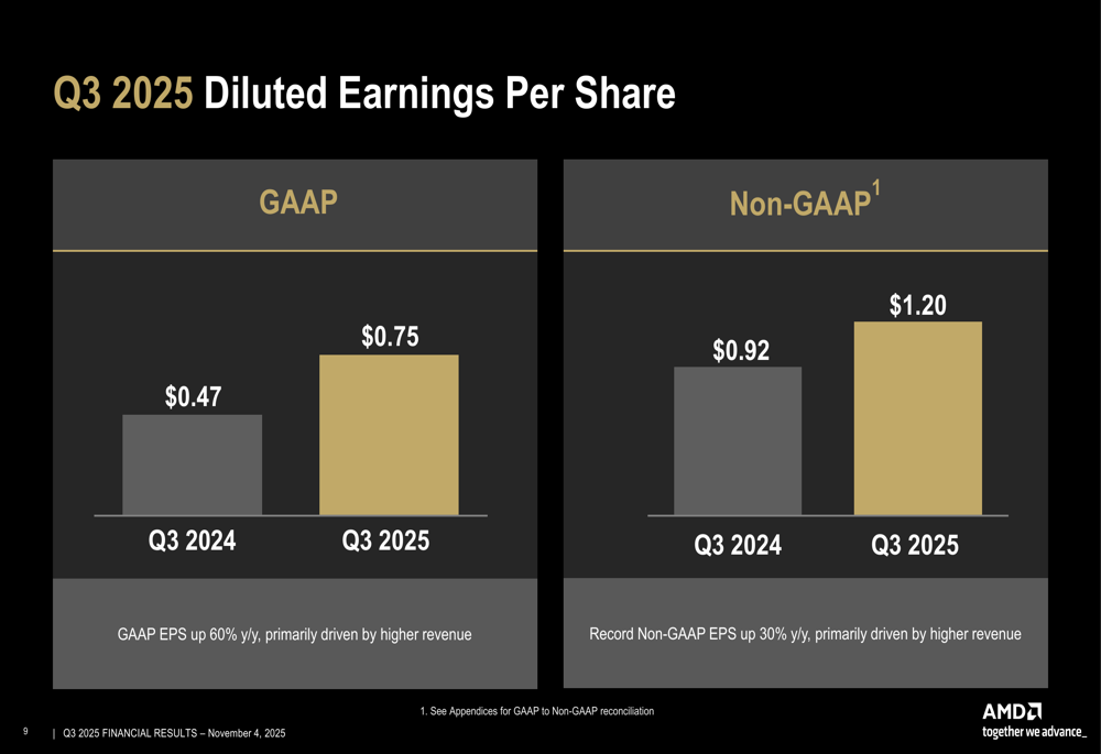 AMD achieved record revenue of $9.2 billion in Q3 2025, a 36% increase compared to the same period last year. This growth was primarily driven by strong demand across the company's Data Center AI, Server, and PC businesses.