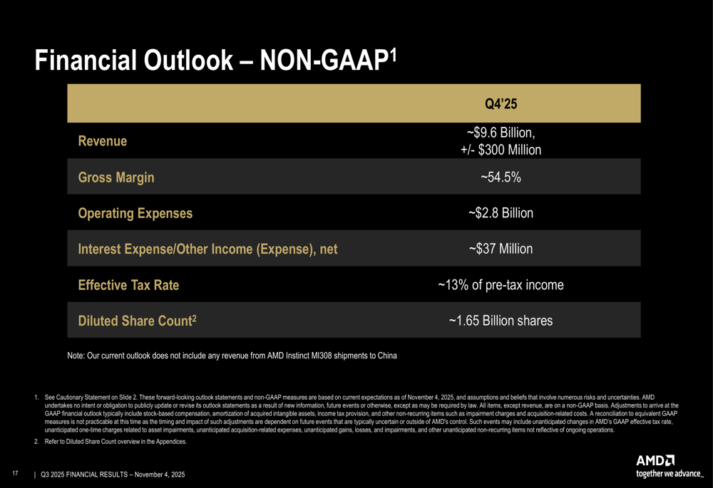 AMD noted that its guidance does not include any revenue from AMD Instinct MI308 shipments to China, reflecting ongoing export restrictions.