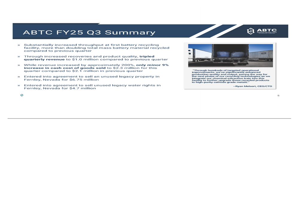ABTC has made substantial operational progress in its battery recycling business, implementing round-the-clock operations and increasing both shift counts and operators per shift to match growing battery feedstock throughput. The company continues to engage with multiple strategic partners for sourcing feedstock and selling recycled battery products.