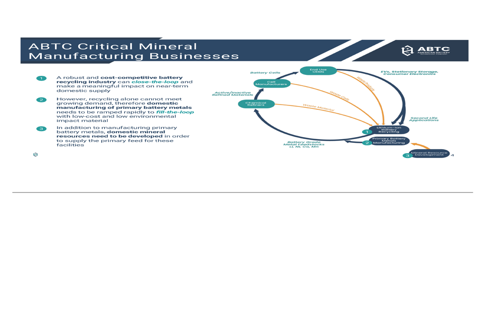 This approach addresses the growing need for sustainable battery materials as electric vehicle adoption increases. By recycling lithium-ion batteries from various sources including EVs, stationary storage, and consumer electronics, ABTC aims to reduce dependence on new mining while recovering valuable materials.