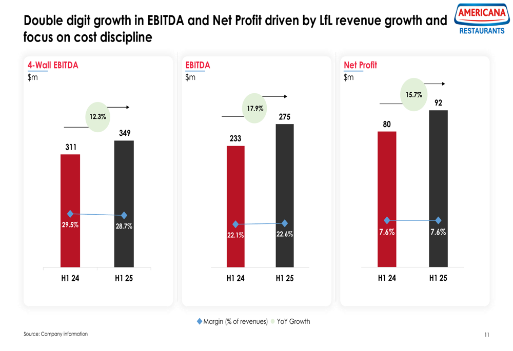 Americana’s 15.6% revenue growth was fueled by robust like-for-like sales growth of 12.4% and contributions from new store openings. The company’s EBITDA increased by 17.9% to $274.9 million, while net profit rose by 15.7% to $92.5 million, indicating improved operational efficiency.