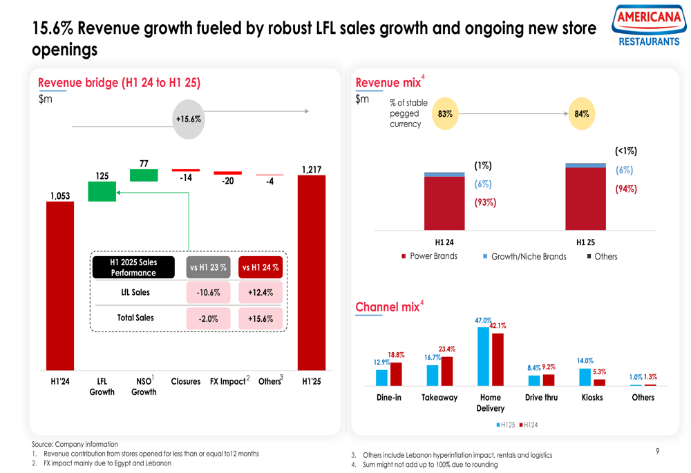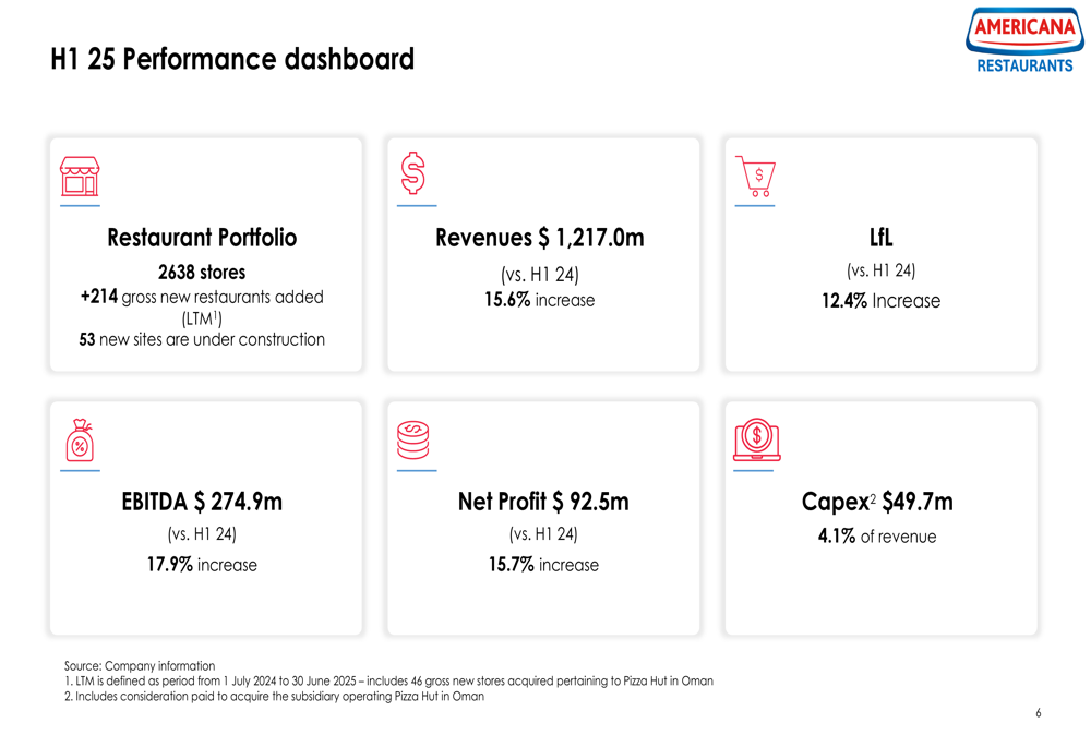 Americana Restaurants International PLC (ADX:AMR) reported robust financial results for the first half of 2025, with double-digit growth across all key metrics. The company’s revenue increased by 15.6% to $1.22 billion, while net profit grew by 15.7% to $92.5 million compared to the same period last year. This growth was driven by a combination of strong like-for-like (LfL) sales performance and aggressive store expansion.