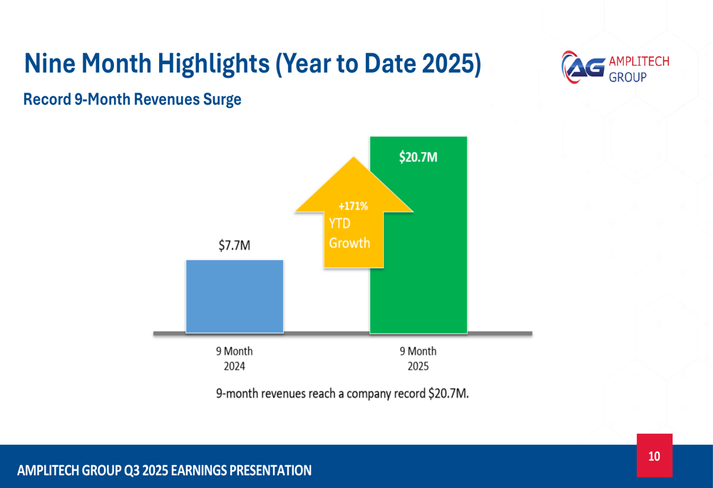 Looking at year-to-date performance, AmpliTech achieved record nine-month revenues of $20.7 million, representing a 171% increase over the $7.7 million reported for the same period in 2024.