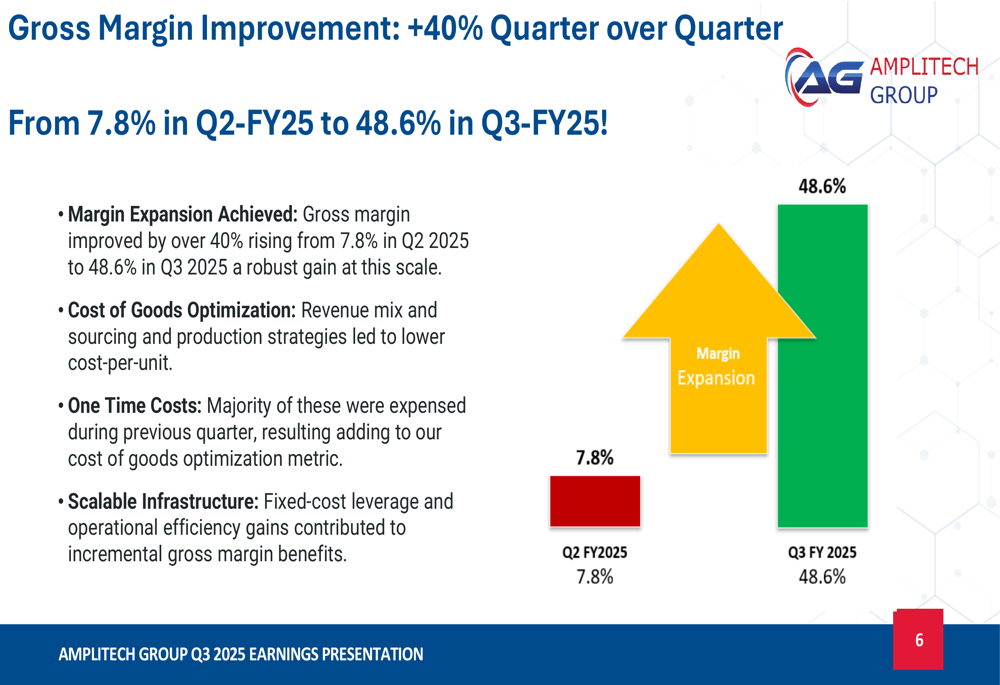 Perhaps most notable was AmpliTech’s dramatic improvement in gross margin, which expanded by over 40 percentage points quarter-over-quarter, rising from 7.8% in Q2 2025 to 48.6% in Q3 2025. This substantial margin expansion resulted from cost of goods optimization, resolution of one-time costs from the previous quarter, and scalable infrastructure providing fixed-cost leverage.