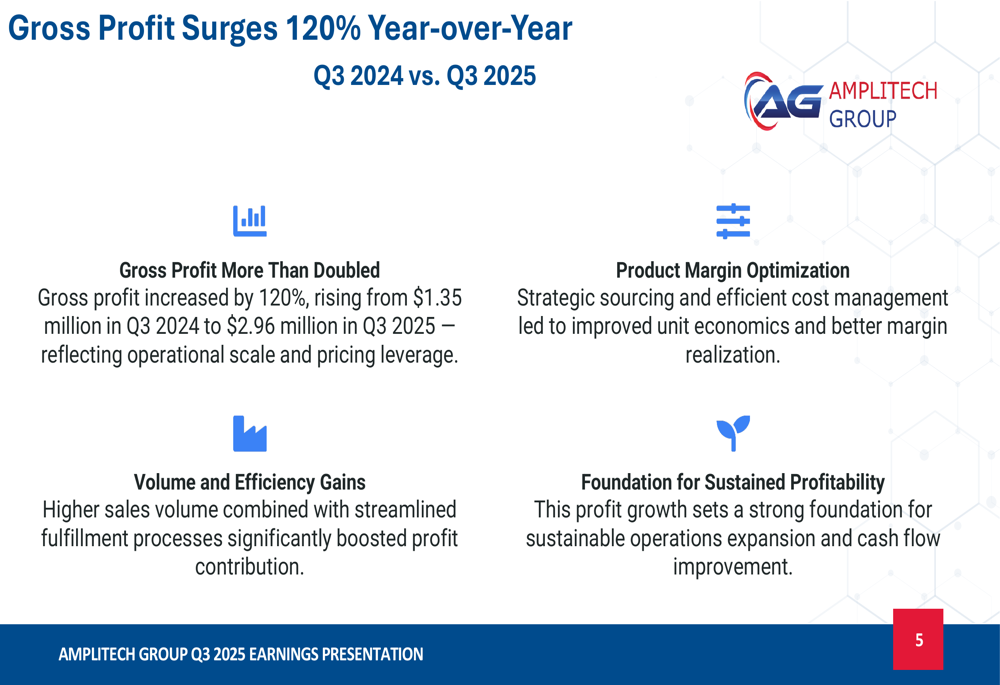 AmpliTech reported explosive revenue growth in Q3 2025, with sales surging 115% year-over-year to reach $6.09 million, compared to $2.83 million in Q3 2024. This growth reflects expanding market adoption and increased customer retention across all core segments, as well as improved sales execution and pricing strategies.