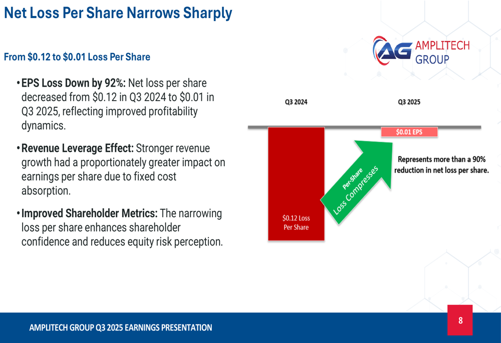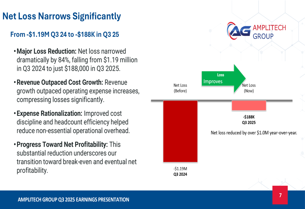 AmpliTech’s path to profitability became much clearer in Q3 2025, with net loss narrowing significantly by 84%, falling from $1.19 million in Q3 2024 to just $188,000 in Q3 2025. This improvement resulted from revenue growth outpacing operating expense increases, improved cost discipline, and headcount efficiency.