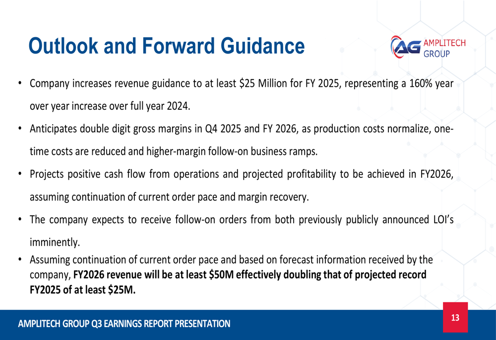 AmpliTech anticipates double-digit gross margins in Q4 2025 and throughout FY 2026 as production costs normalize, one-time costs are reduced, and higher-margin follow-on business ramps up. The company expects to achieve positive cash flow from operations and profitability in FY 2026, assuming continuation of the current order pace and margin recovery.
