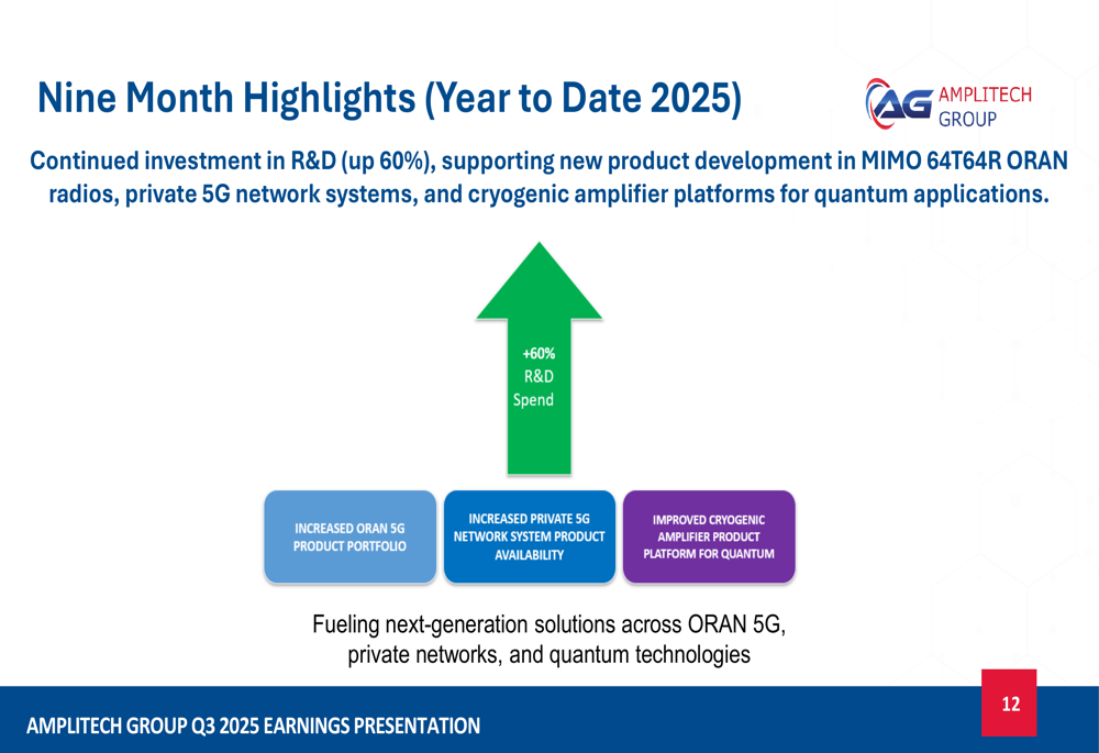 AmpliTech continues to invest heavily in research and development, with R&D spending up 60% year-to-date. This investment supports new product development in MIMO 64T64R ORAN radios, private 5G network systems, and cryogenic amplifier platforms for quantum applications.