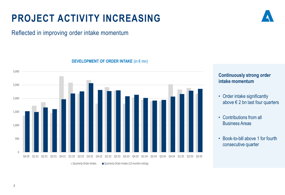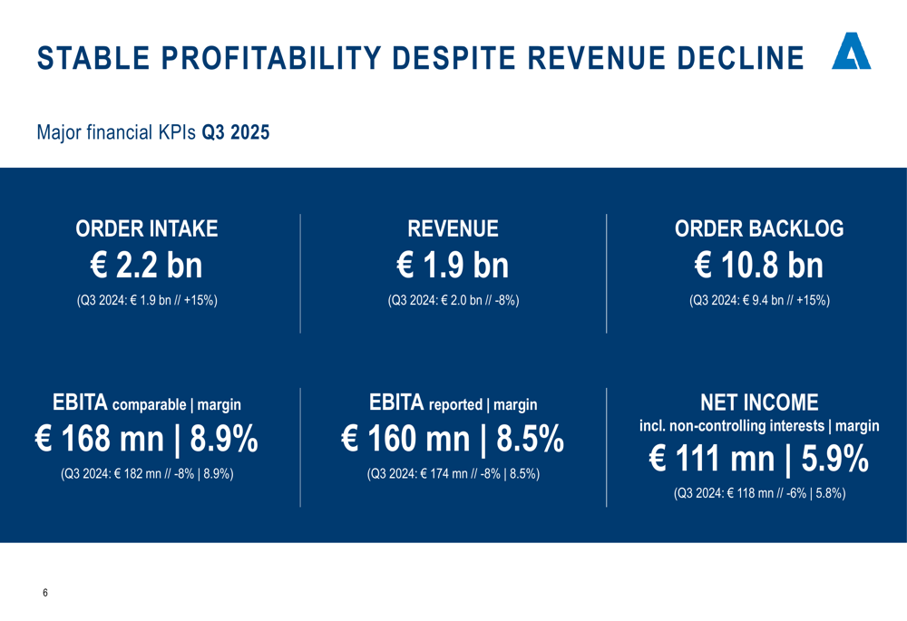 The third quarter of 2025 showed similar trends, with order intake growing by 15% to €2.2 billion while revenue decreased by 8% to €1.9 billion compared to Q3 2024: