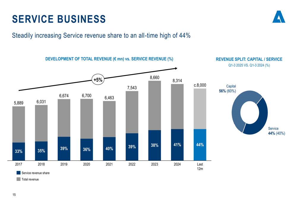 A key strategic focus for Andritz has been growing its service business, which reached an all-time high of 44% of total revenue in Q1-3 2025, up from 40% in the same period of 2024. This shift helps stabilize revenue and improve margins: