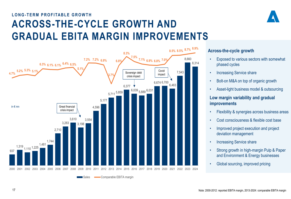 Andritz has demonstrated long-term profitable growth over the past two decades, with gradual EBITA margin improvements and across-the-cycle growth due to its diversified exposure across various sectors: