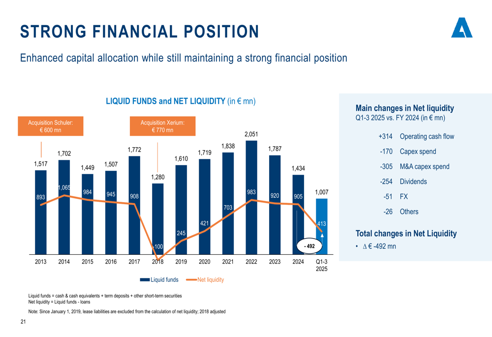 Andritz has maintained a strong financial position despite increased M&A spending. The company reported liquid funds of €1,006 million for Q1-3 2025, supporting its strategic acquisitions while maintaining financial stability: