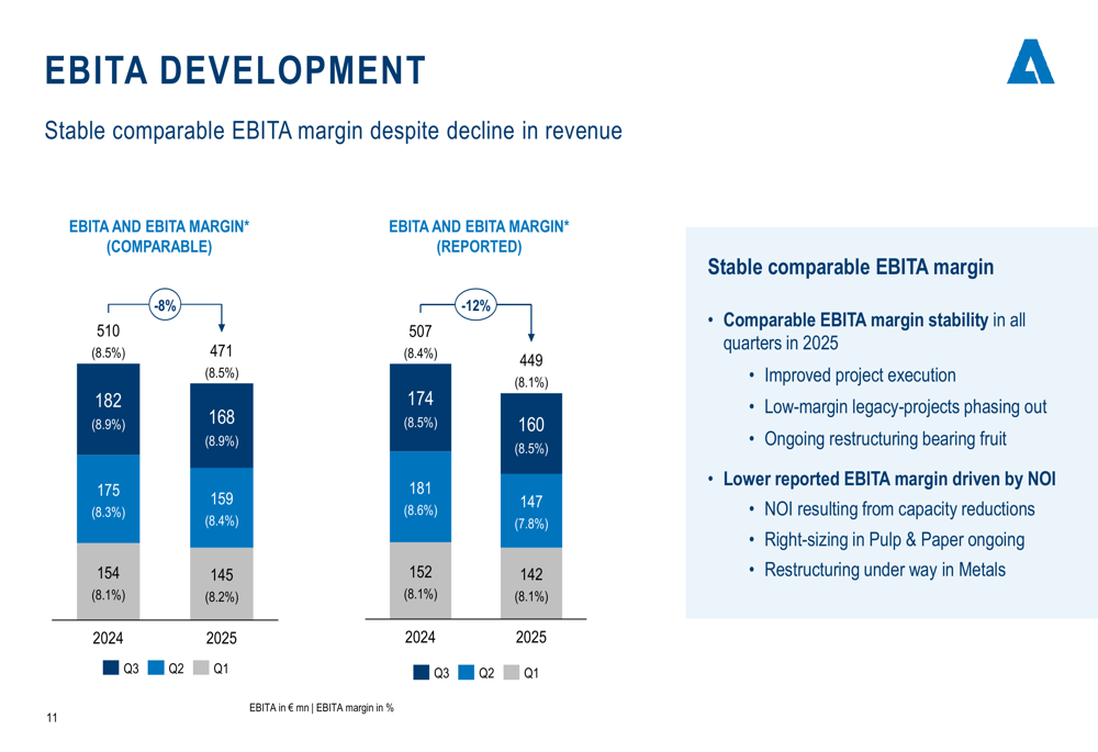 Despite the revenue decline, Andritz maintained a stable comparable EBITA margin of 8.5%, demonstrating effective cost management and operational efficiency. The EBITA development shows consistent margin performance throughout 2025: