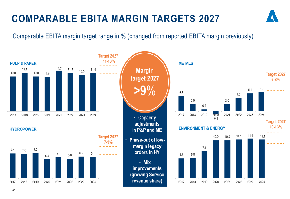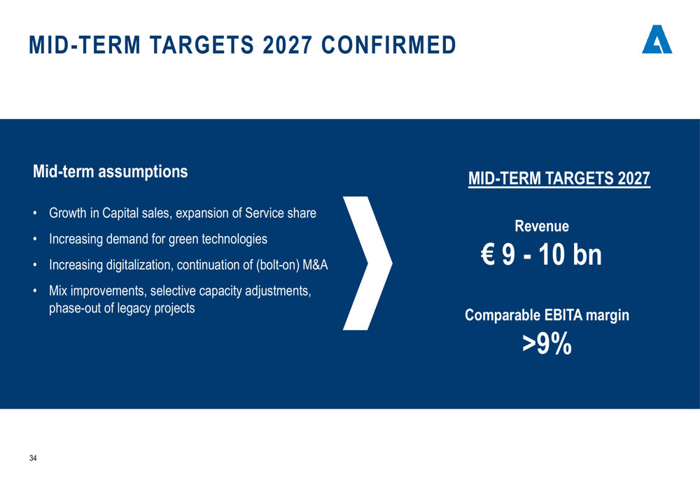 Looking further ahead, Andritz reaffirmed its mid-term targets for 2027, aiming for revenue of €9-10 billion and a comparable EBITA margin above 9%. These targets are based on assumptions of growth in capital sales, increasing demand for green technologies, and mix improvements: