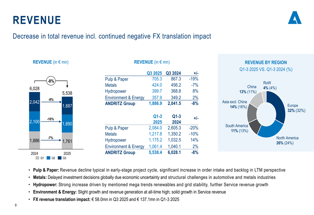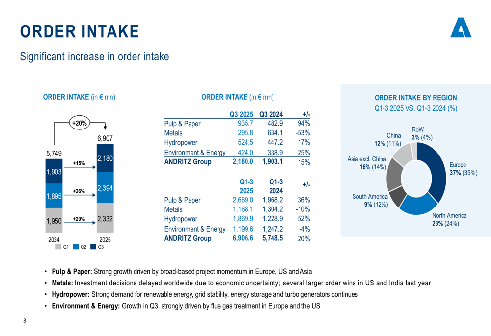 Andritz reported robust financial performance for the first nine months of 2025, with order intake reaching €6.9 billion, up 20% from €5.7 billion in the same period of 2024. This growth occurred despite an 8% decline in revenue to €5.5 billion, down from €6.0 billion in Q1-3 2024.