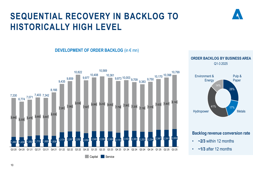 Breaking down the order intake by business area, Pulp & Paper showed the strongest growth at 27% for Q1-3 2025, followed by Environment & Energy at 18% and Hydropower at 17%. The Metals segment experienced a 3% decline due to delayed investment decisions: