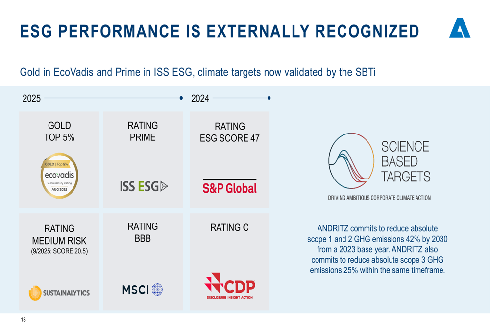Andritz has also made significant progress in sustainability, receiving Gold status from EcoVadis and Prime status from ISS ESG. The company has committed to reducing absolute scope 1 and 2 GHG emissions by 42% and scope 3 emissions by 25% by 2030: