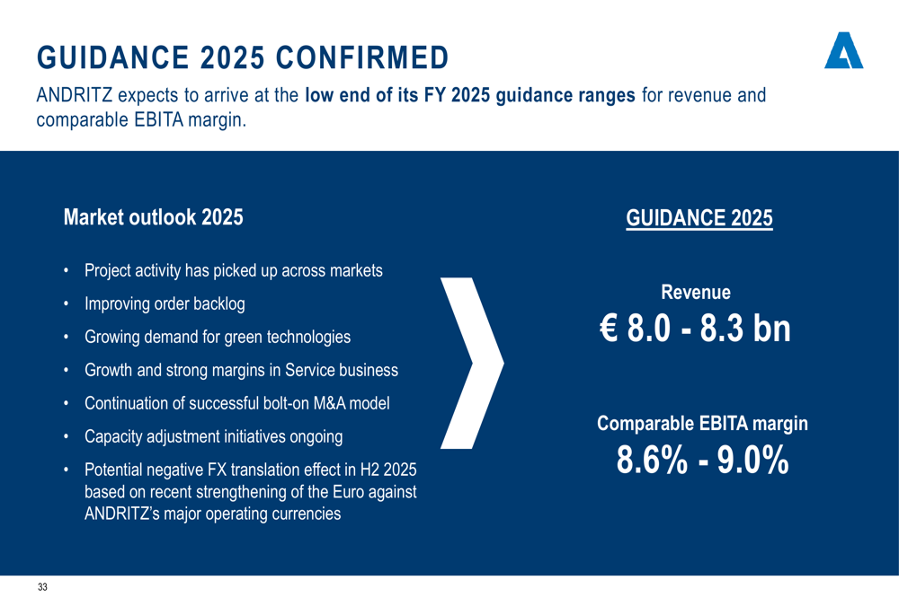Andritz confirmed its guidance for 2025, expecting to achieve the lower end of its revenue target range of €8.0-8.3 billion and comparable EBITA margin of 8.6-9.0%. The company noted potential negative impacts from FX translation effects but expects no direct adverse impact from increasing trade barriers: