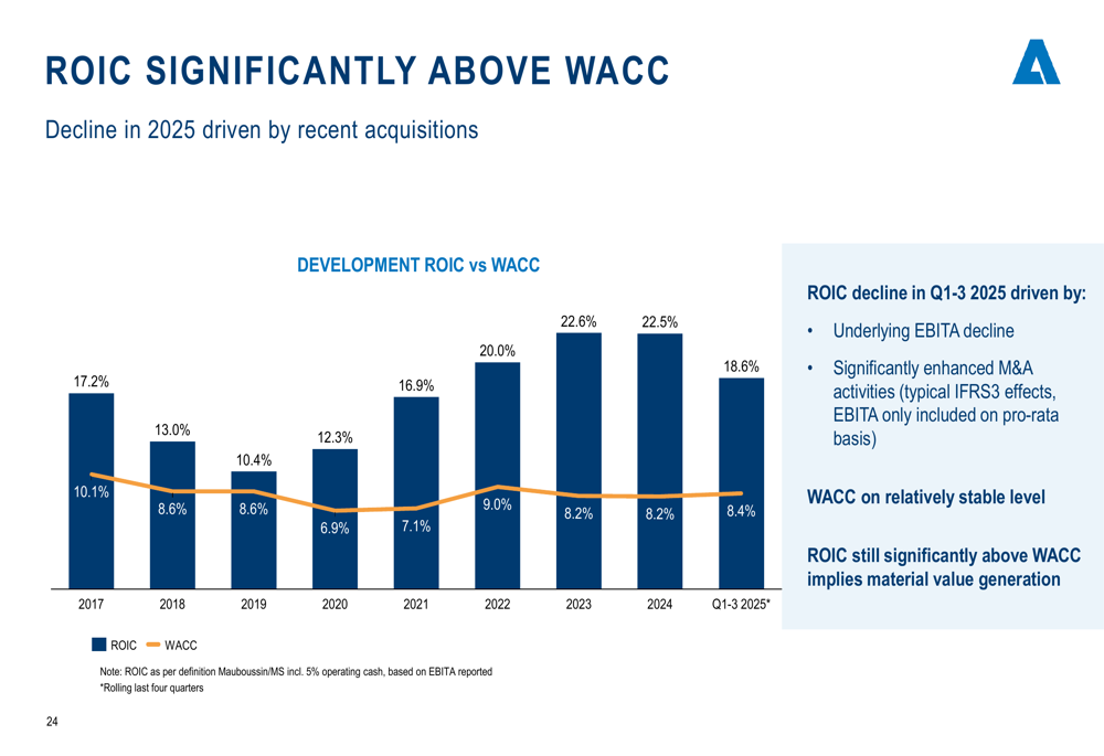 The return on invested capital (ROIC) remains significantly above the weighted average cost of capital (WACC), indicating efficient capital allocation and value creation, although there was a decline in 2025 due to recent acquisitions: