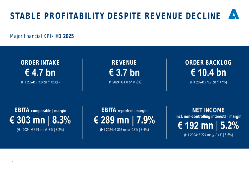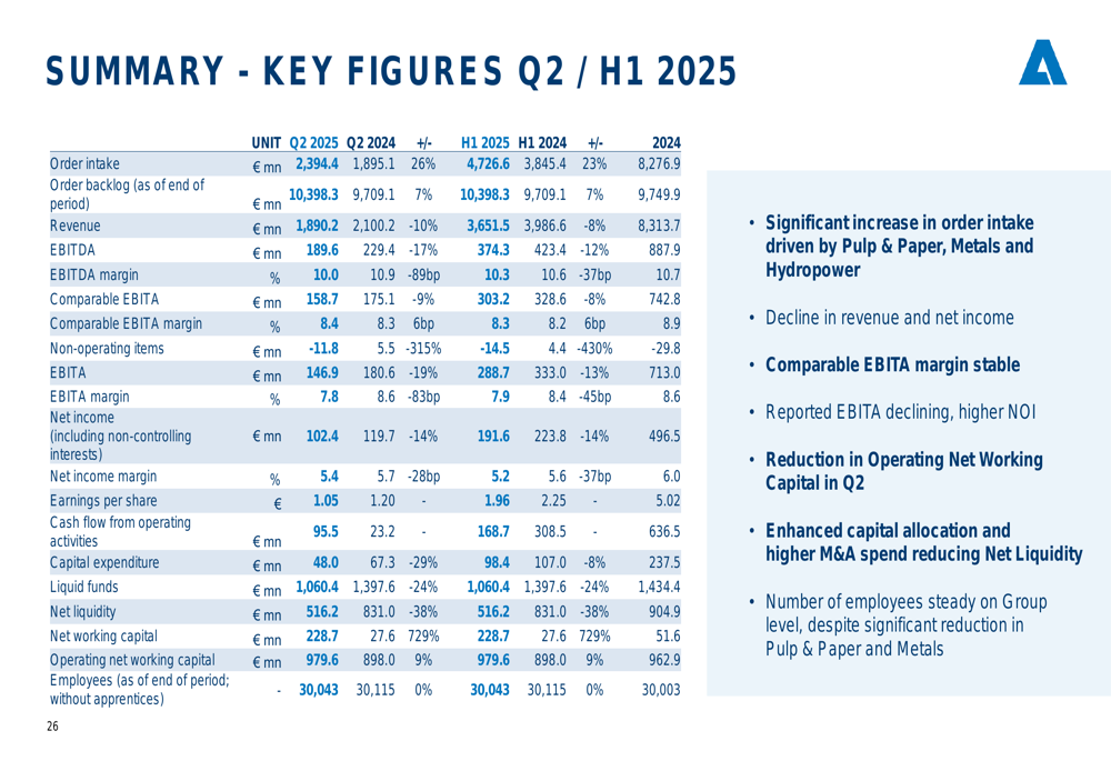 Despite the strong order intake, revenue decreased by 10% to €1.9 billion in Q2 2025 and by 8% to €3.7 billion for H1 2025 compared to the same periods in 2024. The company attributed this decline to a high revenue base in the previous year and a moderately negative foreign exchange impact of -2% in H1. Nevertheless, Andritz maintained stable profitability with a comparable EBITA margin of 8.4% in Q2 2025, slightly improving from 8.3% in Q2 2024.